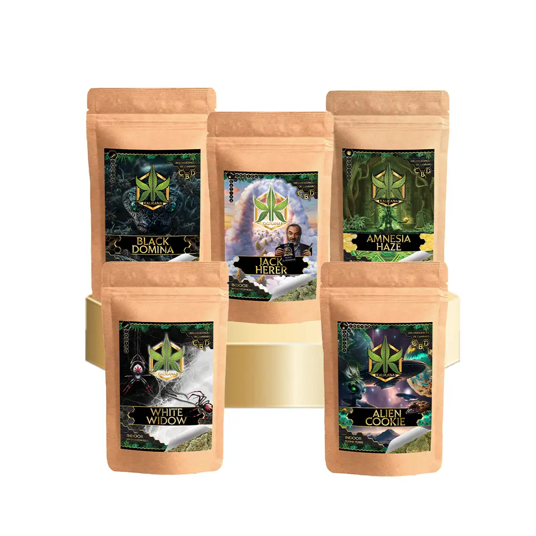 Vous voulez découvrir l’excellence des fleurs indoor sans vous disperser ? Le Mini Pack Kali Premium 5g réunit 5 classiques incontournables d’1g chacune : Black Domina, Jack Herer, Amnesia Haze, White Widow et Alien Cookie. Ce sont des variétés qui ont fait leurs preuves, plébiscées par nos clients pour leur qualité constante, leur intensité aromatique et leur profil équilibré.